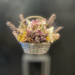 Price: $138.00 Dried and Preserved flowers in basket (containers/botanicals vary) Product Tags: Same-day Delivery